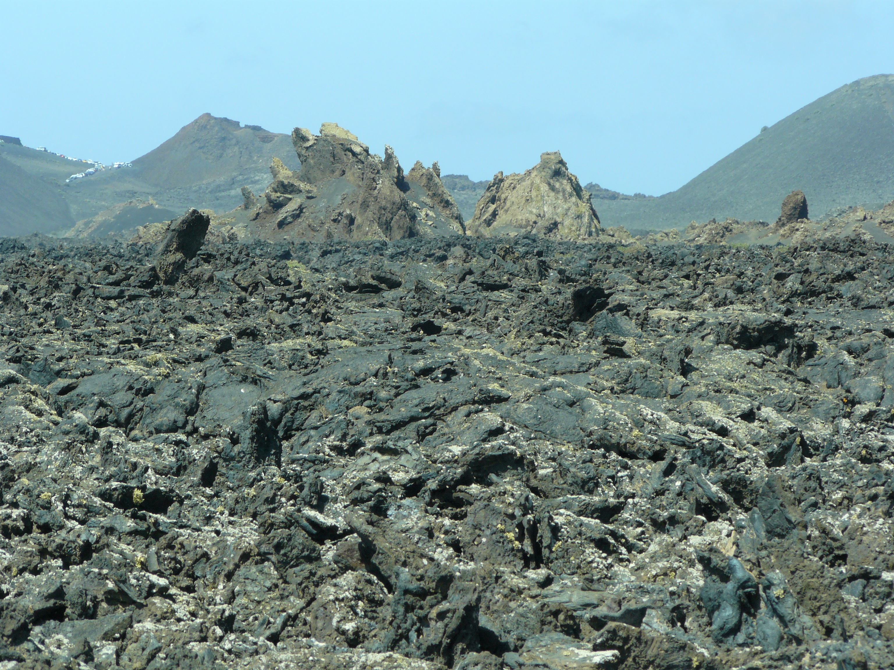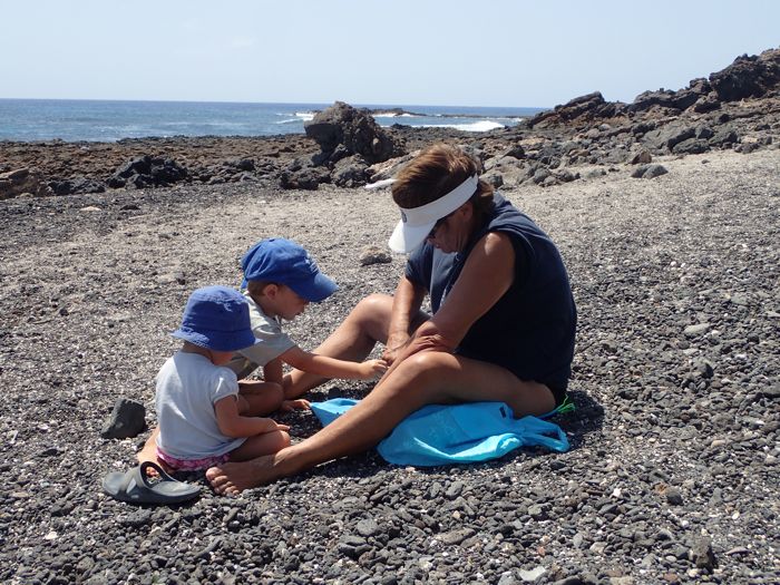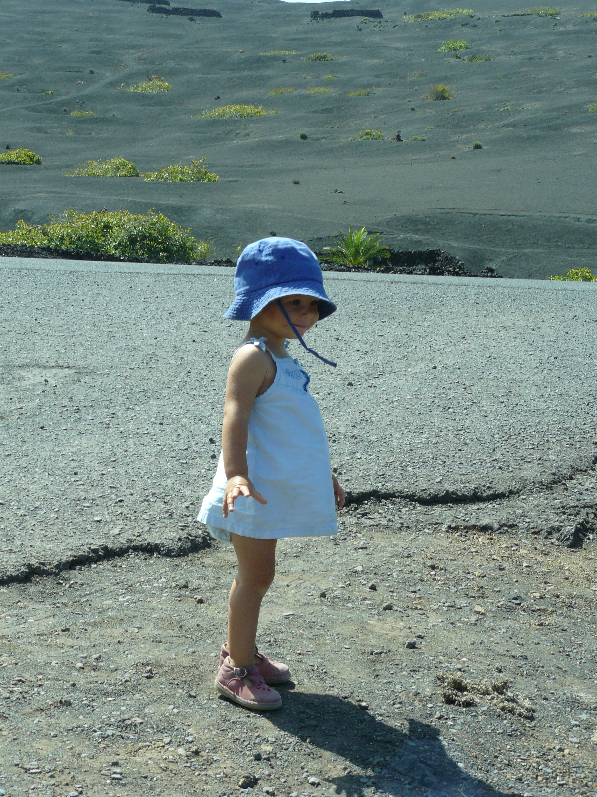 Nous passons 3 jours sur d’excellents fonds de sables sur lesquels se promènent de grandes raies noires. Guilhem se régale dans les petits rouleaux et s’initie au body-board. Juste à coté, nous faisons escale à Rubicón, marina clinquante avec piscine, d’où nous partons en voiture à la visite de l’île. Tout le quart sud ouest à été recouvert par les éruptions du XVIIIème qui ont duré 6 ans ! Le parc de Timanfaya conserve intacte ce spectacle et nous traversons sur des kilomètres les champs chaotiques de lave noire. Petit intermède au musée des volcans avec une démonstration d’éruption son et lumière en sous sol qui va traumatiser pour plusieurs semaines notre Guilhem ! Un peu plus loin, nous sommes surpris de voir émerger de ce désert noir des centaines de vignes plantées dans des cônes de sable volcanique et abritées par des murets de pierre sèche pour conserver un maximum d’humidité. Anne Marie soulève les branches rampantes et effectivement les belles grappes sont bien là ! Nous achetons une bouteille au cas où le vin serait bon, même si celui ci est plutôt réputé sur l’ile voisine de Tenerife!