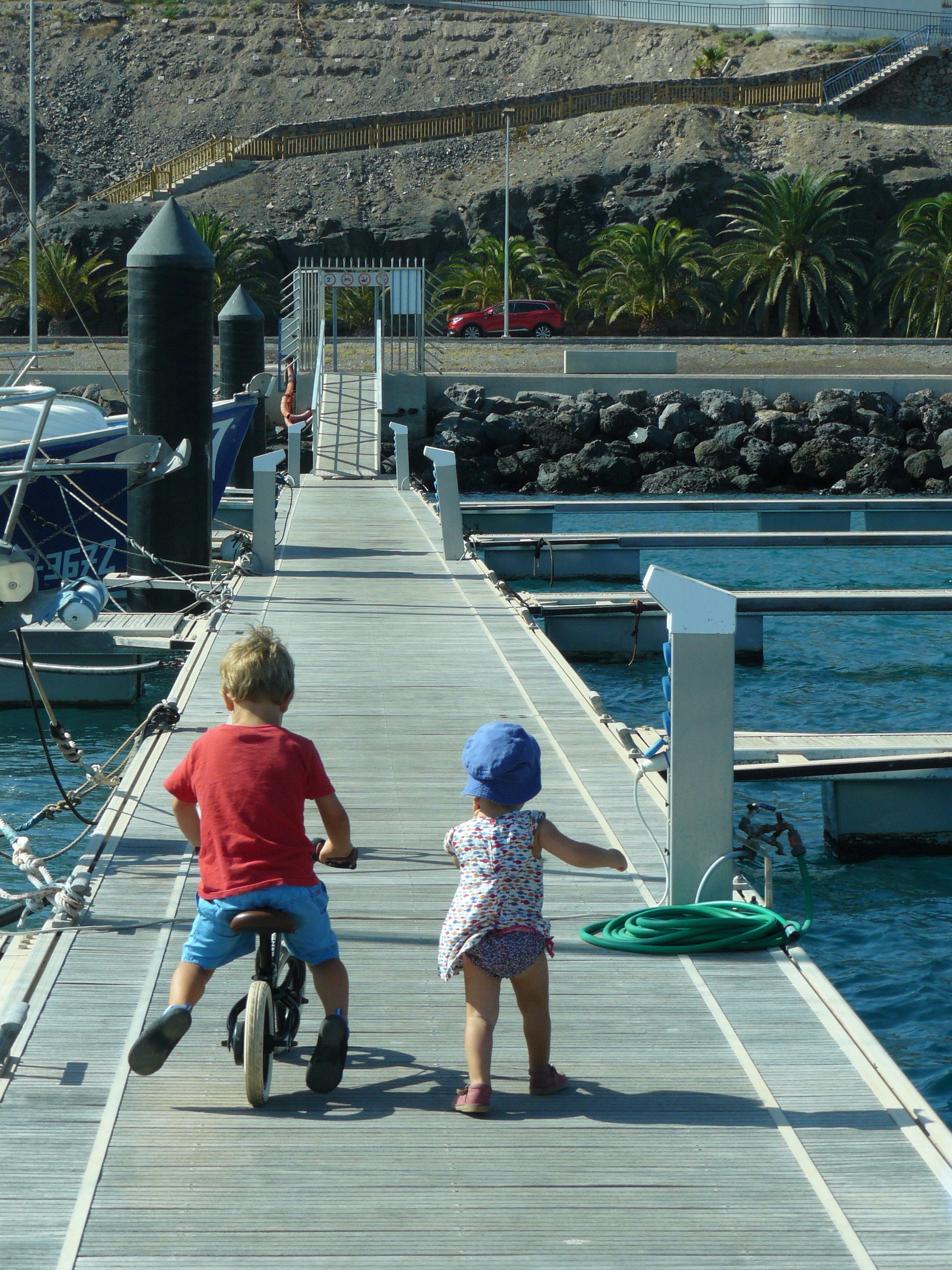 Sur les pontons l’ambiance est excellente, la plupart des voiliers sont habités et les voiliers de voyage nombreux. Nous recroisons les équipages déjà vu car nous faisons grosso modo la même route et le vin rouge coule à flot avec nos amis de Ganéoch. Nous rencontrons aussi Fanny et sa sympathique tribu, venus en vacance de Montpellier préparer leur voilier pour la transat.