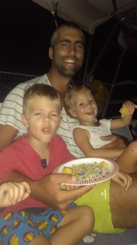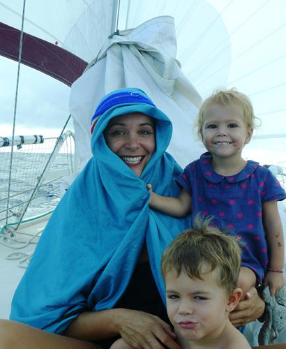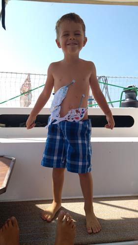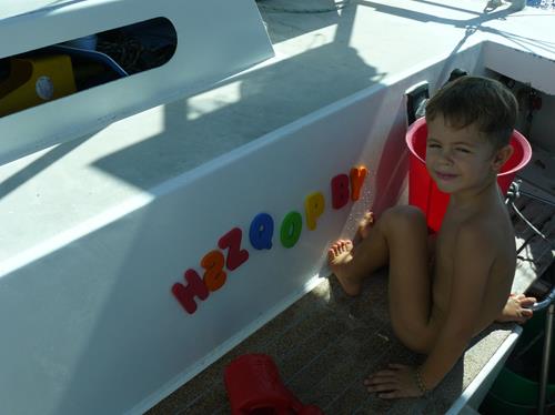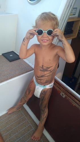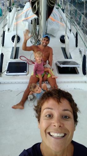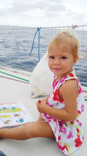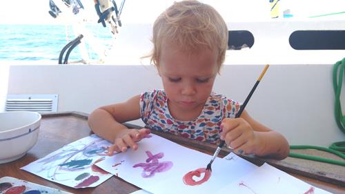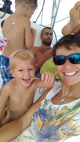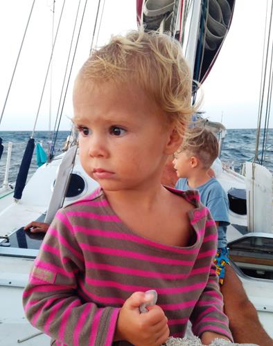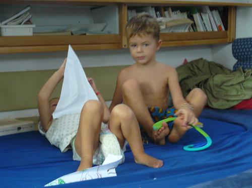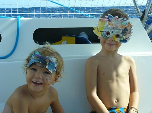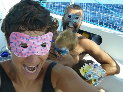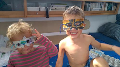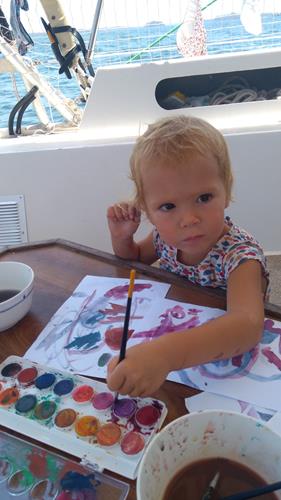 Les premiers jours de traversées sont idylliques. Des conditions parfaites, pas trop chaud, peu de houle, une agréable atmosphère familiale. Les nuits sont calmes et les quarts se suivent ainsi. Marine 21h-1h30, Oliv 1h30 -7h. La journée, je tente de me transformer en super maman et d’organiser une activité sympa par jour : peinture sur pâtes et confection de colliers, pâte à sel, peinture, pâte à modeler… Oliv se transforme en voiture de course pour le plus grand bonheur des enfants !