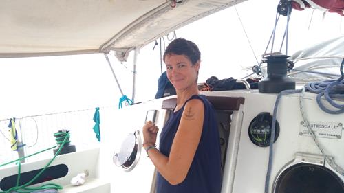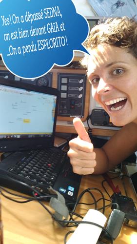 Puis vinrent 3 jours aux conditions météo plus difficiles, avec une mer agitée, pas mal de vent, et un temps de chien ! Mais quelle surprise quand nous vîmes un voilier au loin…qui était SEDNA, nos copains partis 24h avant nous ! Quel hasard, nous ne savions pas quelle route ils empruntaient. Nous sommes ravis de les doubler !! Enfin, à J11 nous trouvons nos alizés au 8eme degré sud. Et le doux temps qui va avec. L’océan grouille de thon qui sautent, Oliv en pêche un en 30 secondes (ce n’est pas une facon de parler !), des arcs en ciel jaillissent du ciel : nous sommes au paradis ! Pour accompagner les sashimis qui nous attendent (le gingembre confis, soy sauce étant prêts à être ouverts), Guigui et Fifi nous préparent un fondant au chocolat !