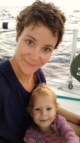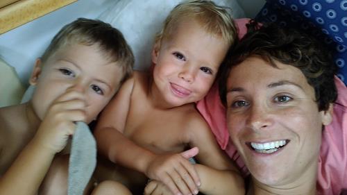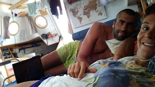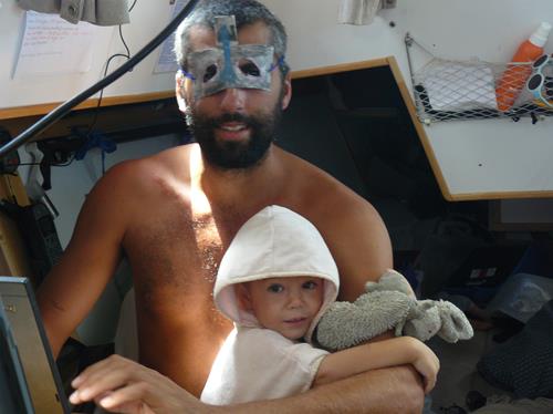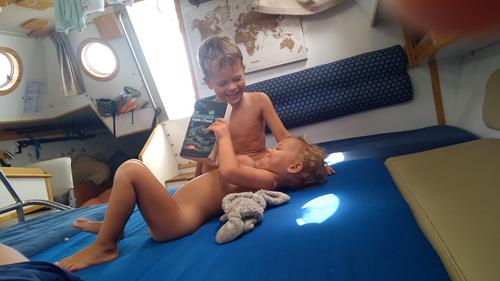 Cette première semaine de navigation se déroule dans une atmosphère joyeuse, douce, familiale. Les enfants se sentent bien, et nous aussi. Nous prenons le temps de prendre soin d’eux, faire des « activités », jouer ensemble, rire, beaucoup de bisous, cuisiner. Guilhem et Philippine alternent entre disputes et jeux…mais passent tout de même plus de temps à jouer ensemble. Je suis fière d’eux. Très fière. Pas une fois ils réclament la terre. En fait cette vie est leur normalité. Ne pas poser le pied à terre, avoir sa maison penchée des heures durant, avoir des difficultés à se déplacer a bord, c’est normal pour eux. Et cela l’est devenu pour nous. La 1ere semaine, nous jouissons d’une nourriture de luxe en abondance : des fruits, des légumes, mais surtout des chipolatas, de la terrine cognac pistache, du pâté fermier, lardons… Nos passe-temps à nous : le sextant, la lecture, la mise à jour des congrès d’urologie pour Oliv, et la lecture, la méditation, les films pour moi.