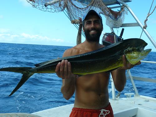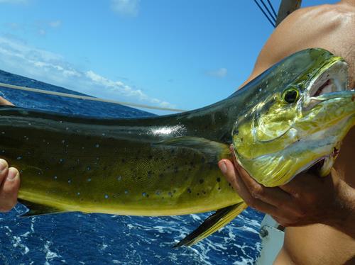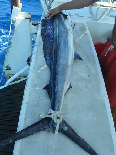 23ème jour, nous pêchons enfin notre espadon ! Non sans mal, mais Oliv parvient à remonter l’animal d’1m70 ! Cet animal est impressionnant, très bleu…et délicieux ! En filet, en gratin, en terrine ou en boulette, il s’invite à tous nos repas ! Et enfin, nous arrivons le 28eme jours, pêchons une superbe dorade coryphène juste avant l’arrivée .