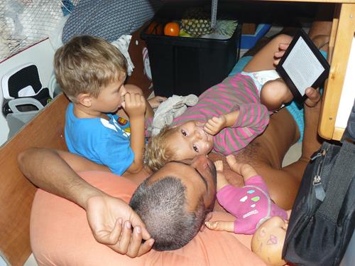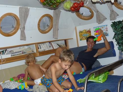 S’en suivent un continuum de journées, sous les alizés sud est, entre 12 et 15 noeuds. La houle est variable mais nous sommes rodés, elle ne nous gêne plus guère. Les enfants nous surprennent d’ autonomie et passent beaucoup de temps à jouer ensemble. Lego, treuillage de lapins, dinosaures,dessin… au bout de 2 semaines ils ne se lassent pas. Pas une seule fois ils me demandent quand est ce qu’on arrive. En fait, cette traversée m’apprend beaucoup à leur sujet : nous sommes à leur entière disposition pour les câliner, leur lire ou inventer des histoires (activité où excelle oliv), faire des carnets, des pâtes a sel…etc… Dès lors, ils sont comblés et ne réclament pas l’arrivée. Et l’activité physique ? me questionnerez vous : et bien dans leur monde d’enfant, Karemo est un voilier de … 50 m de long, regorgeant de cachettes, d’endroit à escalader, de hublot d’où s’échapper ! Etes-vous, une fois adulte, déjà retourné dans la cour de récréation de votre école primaire ? Elle est minuscule comparé à la vision que l’on en avait enfant ! Et bien pour Karemo, c’est pareil ! et cela ne va pas sans nous flatter, que dans l’imaginaire de nos petites têtes blondes, Karemo soit immense !! Dans notre coeur il l’est aussi.