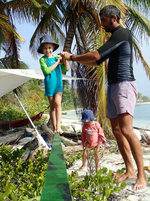 Voila, les San Blas, ce sont des centaines de petites îles au nom imprononçable, où nous voguons 3 semaines durant. Nous retrouvons, encore une fois au hasard, nos copains de SailEat avec qui on partage de délicieux moments entre barbecue, slake line, apnée et apéros. C’est toujours génial de retrouver ses copains des mers. Nous retrouvons également Dario, Marie et Oï ( le chien !) déjà croisés plusieurs fois durant notre périple. Ce fut bien entendu l’occasion de faire un apéro géant à bord, où l’équipage de SailEat se distinguera .