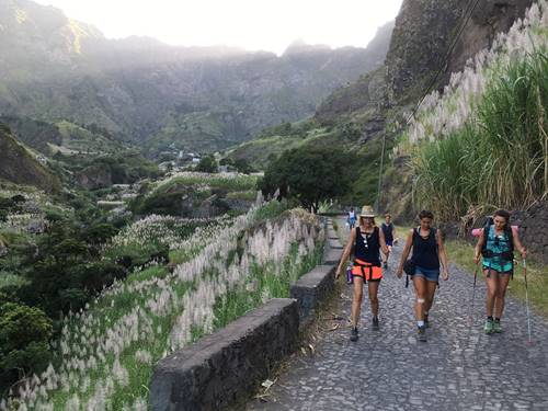 Je pars donc 2 jours et demi, laissant homme et enfants pour parcourir les sentiers de la superbe île de Sao Antao avec les copains. Quel bonheur, 2 jours et demi de rando, d’insouciance, de caïpirinha, de rigolades… Ainsi nous découvrons la splendide vallée de Paul (à prononcer Paôôôuul), où, 6h durant, nous descendrons du volcan jusqu’ au bord de mer, empruntant une vallée verdoyante et pleine de « plumeaux », les champs de cannes à sucre étant en fleur. Un régale pour les 5 filles, tandis que notre pauvre Alexis se tord de douleurs abdominales…il a attrapé la maladie du Cap Vert ! Mais en rien il ne se laisse aller et terminera la rando, tandis que Pedro et Solveig préfèreront l’alugher (photos à l’appui !! Bon, OK, ils ont dormi sous la tente et parcouru le double de dénivelé mais je ne pouvais taire ce moment où ils montent, devant nous, dans le taxi collectif !!)