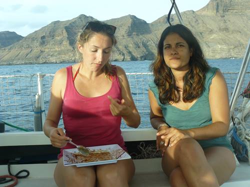 1ere escale : nous visons l’île de Sao Antao pour le mouillage de Tarrafal, où Franscesca aura la drôle d’idée de se faire caresser le corps et le visage par des méduses dès son 1er plongeon . Les deux journées seront rythmées par des Beach volley, balades au village, découverte de l’école, rencontre de Binga et Azavedo, deux sympathiques Cap Verdiens qui organiseront avec nous un énorme barbecue le soir sur la plage : Dîner de langouste, poissons, poulet au rythme de la Kizumba….. où je suis épatée par les qualités de danseuse d’Elodie !!