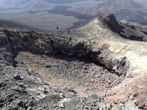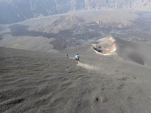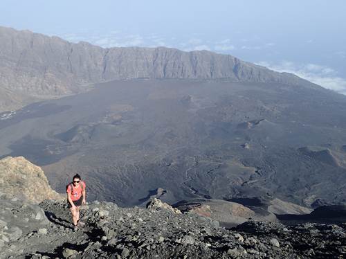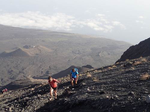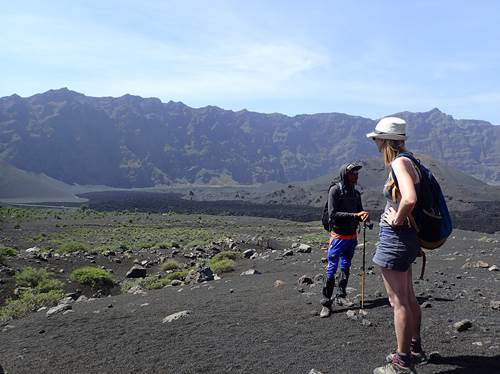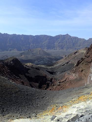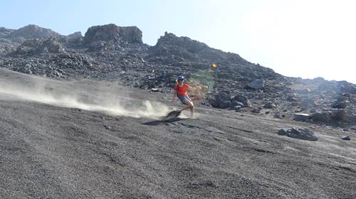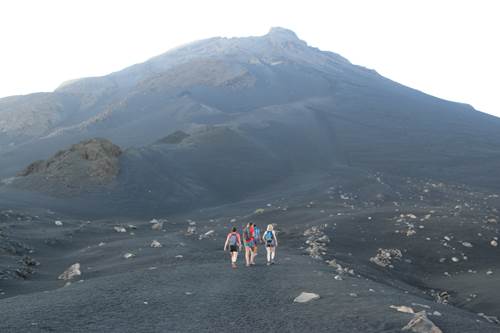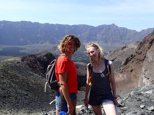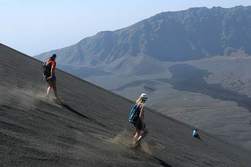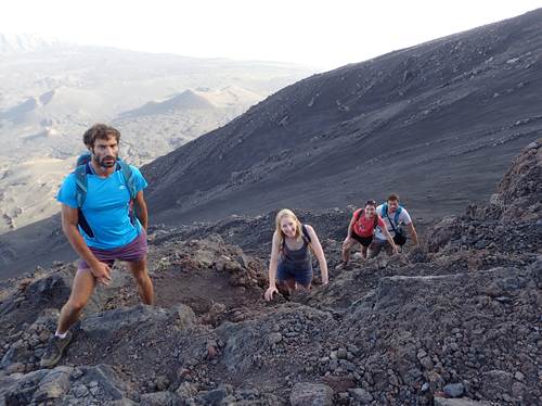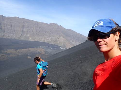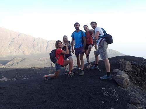 Puis nous quittons Tarrafal pour aller à l’île de FOGO, connue pour son volcan culminant à plus de 2800m, toujours en activité puisque la dernière éruption date de 2015 ! Ainsi nous partons en rando pour gravir le Pico, jouir d’une incroyable vue, et ensuite le descendre en courant dans la lave en « poudre » jusqu’au second volcan, tout coloré ! Quelle belle journée !