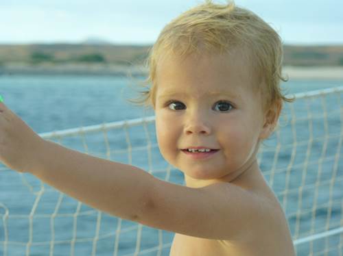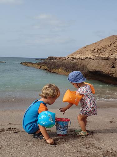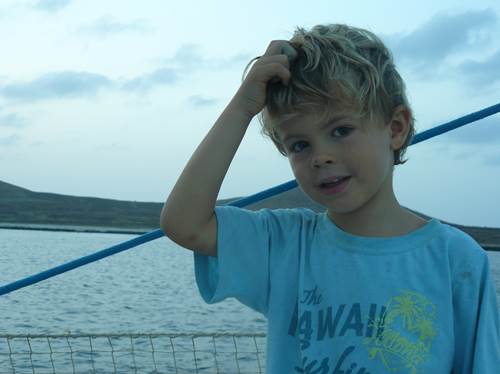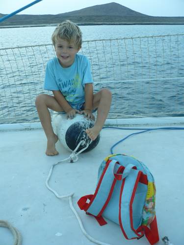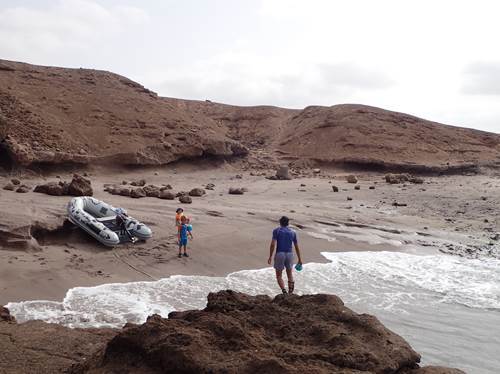 Nous sommes ainsi restés 8 jours au mouillage d’un petit port de pêche pittoresque, et y avons élu notre cantine du soir, où nous découvrîmes les spécialités locales autour d’une délicieuse pression. Parmi elles nous pouvons compter : le garopas, une sorte de mérou rouge fluo tacheté de bleu, à la chair tendre et épaisse ; des bouzios : lamelles de coquillages ( lambis), la murène frite : une tuerie, et surtout, les « cracas » espèce de morceaux entiers de rocher couvert de coquillage en tunnel dont il faut extraire l’animal à la texture et la saveur du crabe : une merveille . Je la dédicace à Erwan, cette découverte ! Après avoir refait le plein de 100 L d’eau-théoriquement potable- nous partons nous isoler 5 jours au mouillage de Mordeira pour une vie en solitaire, sauvage . Après que Phiphi, puis Guilhem et enfin Oliv sont tombés malade avec 40° et tourista, nous pûmes découvrir les bonheurs de cet endroit paradisiaque, isolé. Je me surprends, en attendant leur guérison, (merci Zithromax), à me passionner pour le « carénage-frottage » de Karemo, qui a vu de la salade s’installer sur la coque. Et oui, dans ces eaux chaudes (la mer doit être autour de 28°), les algues pullulent sur les coques des bateaux . Puis Oliv et moi alternons pour faire des footings sauvages dans cette nature sèche. Quelques prises au harpon pour le capitaine, et de nombreux aller retours à la plage pour les enfants.