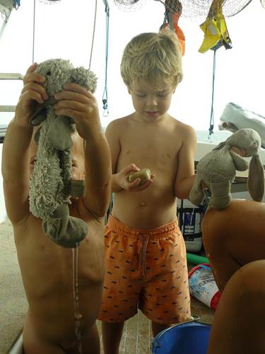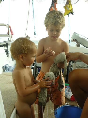 Les journées s’organisent autour des allers/venus à la plage, où Guigui progressent comme un fou en bodysurf dans les rouleaux, Oliv travaille son paddle, je fais moultes aller venus en nageant et toujours passionnée par le frottage de la coque de Karemo ( Oliv s’est octroyé le coté tribord, et moi le coté babord !)