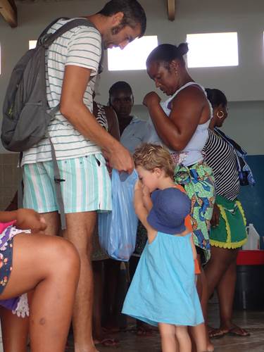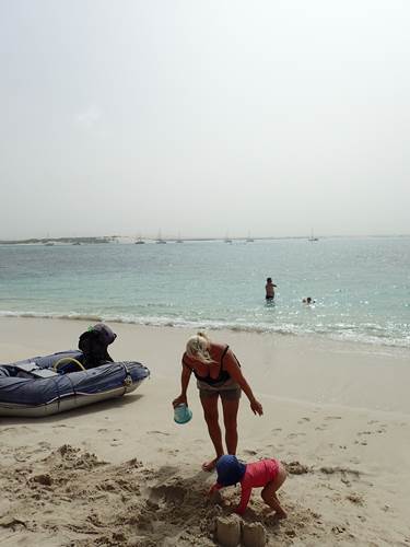 Nous sommes contents car retrouvons Cloclo et Fafa sur Romeli, et aussi l’équipage de SailEat que nous avions rencontrés à Gran Canaria ! Nous mouillons assez loin de la plage, dans une eau turquoise, mais agitée par un bon courant constant . Nous découvrons avec plaisir un loueur de matériel de kite, paddle, surf…. Nous possédons déjà tout ça a bord (excepté le kite qu’oliv aura tenté de réparer maintes heures durant) mais cela donne le ton de l’atmosphère de ce lieu ! Sur place, des jeunes s’amusent, sous nos yeux ébahis, à tout type de jeux d’eau. Mesdames, le mythe des beaux Cap Verdiens est une réalité, c’est impressionnant ! Enfin, un bar restaurant les pieds dans le sable avec un terrain de Beach Volley à disposition devient notre repère : les enfants y passent des soirées libres à jouer dans le sable, et nous, sereins, profitons.