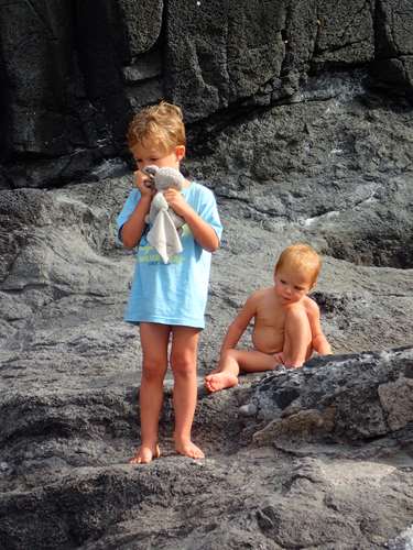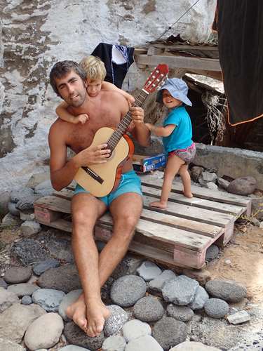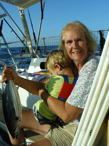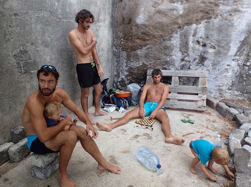 Notre quotidien est rythmé par les aller venus à la plage ou au port, et c’ est une longue organisation avec les deux enfants. Le moindre déplacement prend beaucoup de temps : voici un exemple : une fois l’ancre jetée, lorsqu’on veut aller à terre, il faut : gonfler deux canoés ( ou faire descendre l’annexe et installer son moteur), rechercher les gilets de sauvetages des enfants au fond d’une cale, préparer les sacs d’affaires et penser à mettre ce qui n’est pas étanche ( portable, appareil photo…) ds les sacs étanches ( à chercher dans une autre cale !) au cas où le canoé se renverse, mettre les gilets aux petits qui forcément, au moment de partir, préfèrent rester sur Karemo pour jouer avec les dinosaures, pagayer jusqu à la plage, descendre des canoés : et la au choix : se faire rouler ds les vagues sur de gros cailloux avec les petits, ou bien, marcher sur une grosse raie gluante en sortant !! Oui oui, véridique, Guilhem, puis moi avons eu la drôle ( et désagréable) surprise de vivre cette étrange expérience !Ensuite, après les activités a terre, quelque soit l’heure, il faut rentrer au bateau : et la, le moindre grain de sable est traqué : et donc, c’est forcément, même s’il fait frais en soirée, obligation de retremper les enfants - en pleurs-dans la mer, avant le trajet de retour. Ainsi nos journées sont longues, bien longues, et les enfants se couchent souvent vers 21h30.