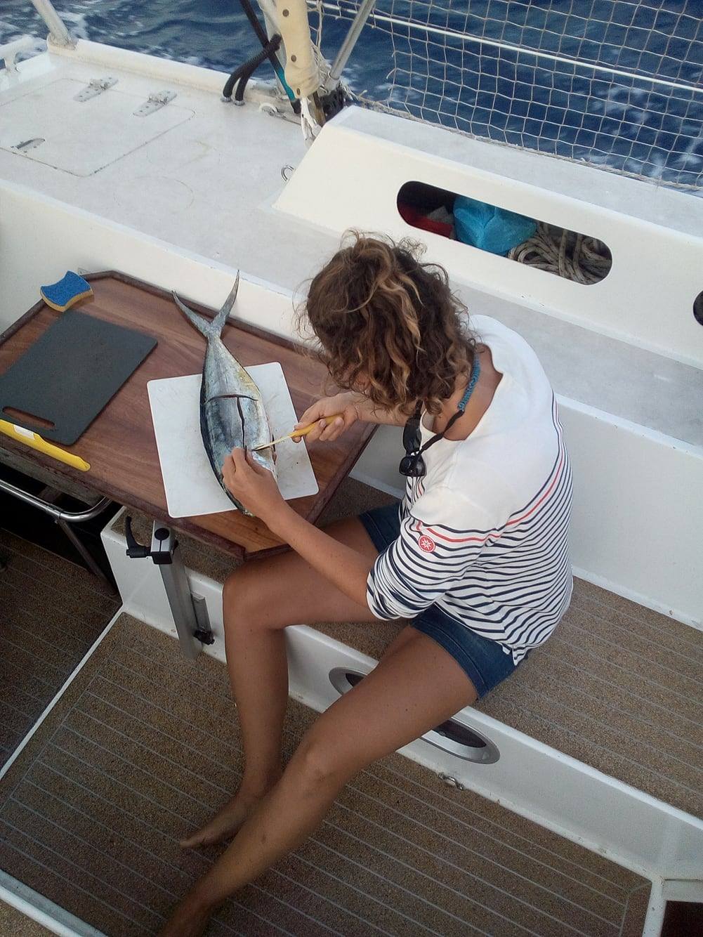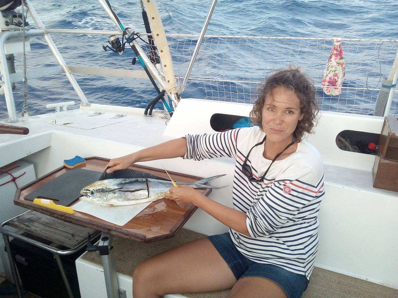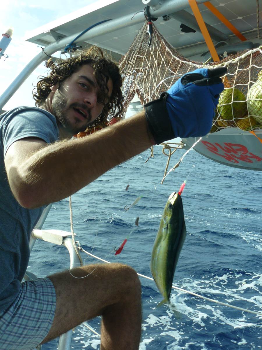 Le moral est au top car Karemo sent l’écurie, la grosse houle nous a permis une cueillette spéciale et c’est dans la grande joie que Marine et Benjamin ramasse une dizaine de gros poissons volants piégés sur le pont par les filets à enfant ! En bonus deux jolies Dorades complètent la pêche du jour.