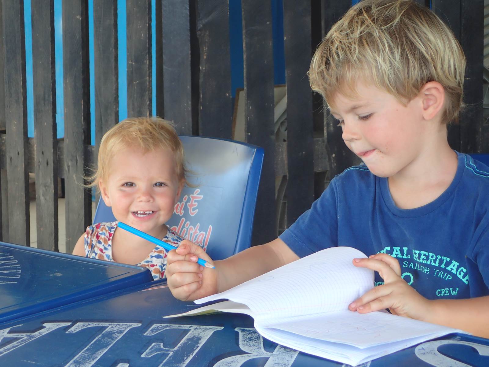 Notre vitesse est toujours un peu en dessous des prévisions mais la mer est agréable et nous savons que le vent va forcir. On en profite donc pour jouer à un nouveau jeu de carte appris par Benj : le Gabo, jeux de carte basé sur la mémoire des cartes, inconnu pour ma part et chose exceptionnelle : toléré par Marine ! La journée se passe entre parties d’échec, lecture, guitare et surtout à occuper les enfants avec de la peinture, gâteaux au chocolat….